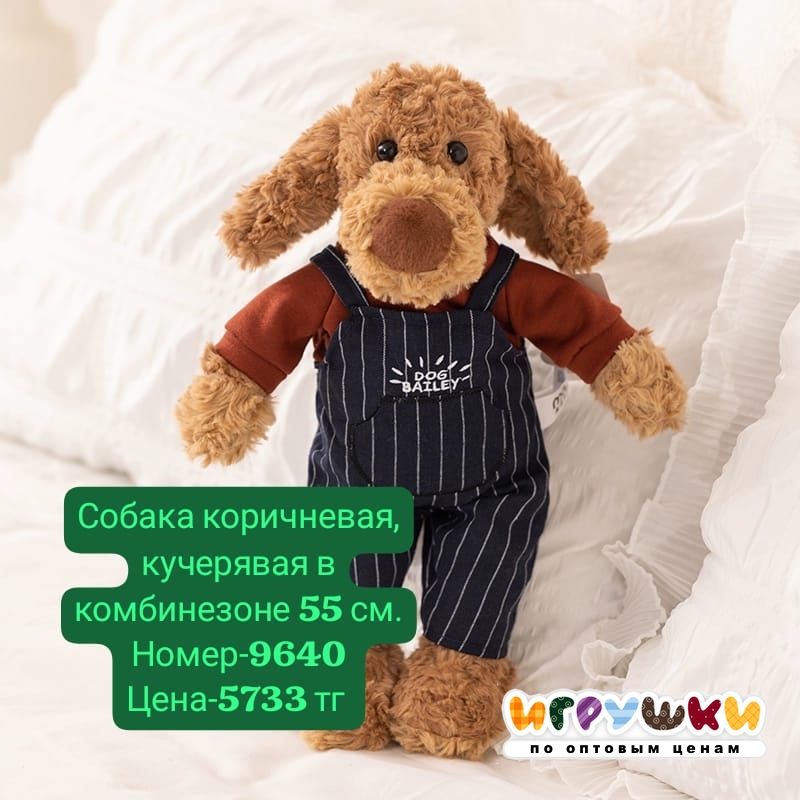 Главная / Игрушки / Мягконабивные игрушки / Собака коричневая, кучерявая в комбинезоне 55 см.